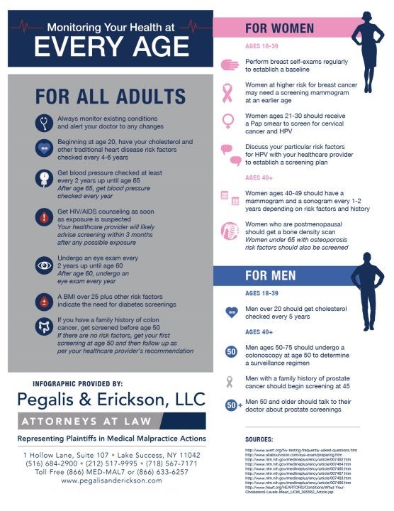 Your health is very important, and it can take some effort to stay in good shape. In addition to eating well and exercising regularly, it’s a good idea to educate yourself on when you should have certain medical tests performed. For example, women without a family history of breast cancer should begin mammograms at an earlier age than those without a family history of the disease. Any medical negligence, including failure to diagnose a condition, could result in you needing a medical malpractice attorney in Long Island, New York. Take a look at this infographic to learn more about the routine testing you should have by age. Please share with your friends and family.
